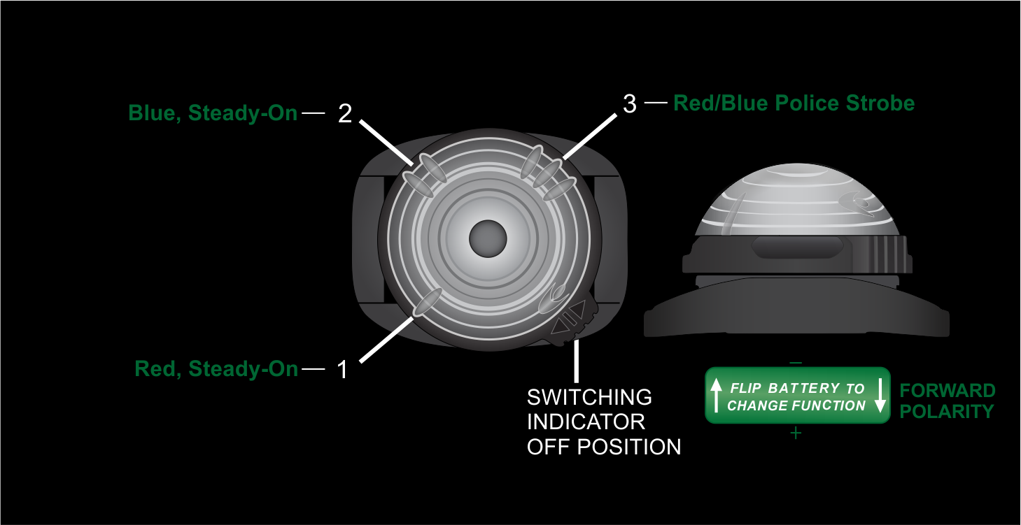 Compact, lightweight and durable beacon with three functions: Red Steady-On, Blue Steady-On and a unique Red/Blue Police Strobe (see the simulator for a visual illustration).
