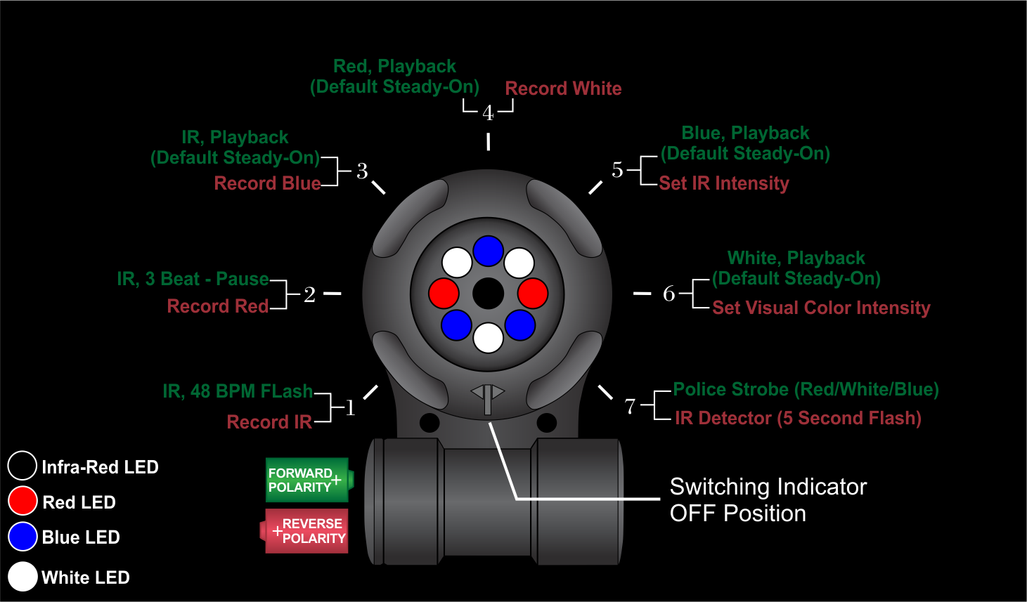 - Four individually programmable flash signatures in IR, Red, Blue, and White.